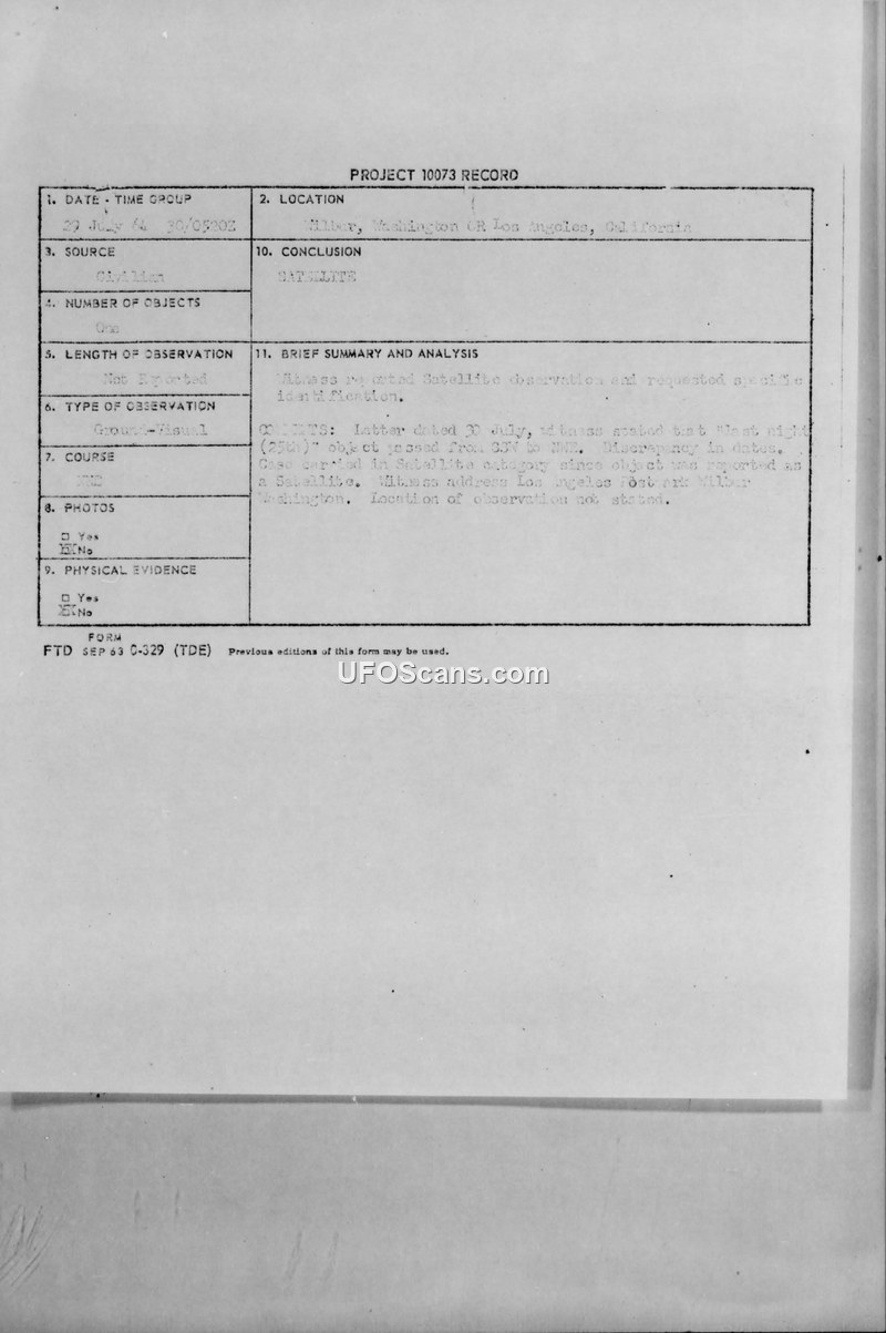 A civilian report of a satellite sighting in Washington state was investigated by the USAF under Project 10073. The Air Force concluded the object was likely the Echo I or Echo II satellite.