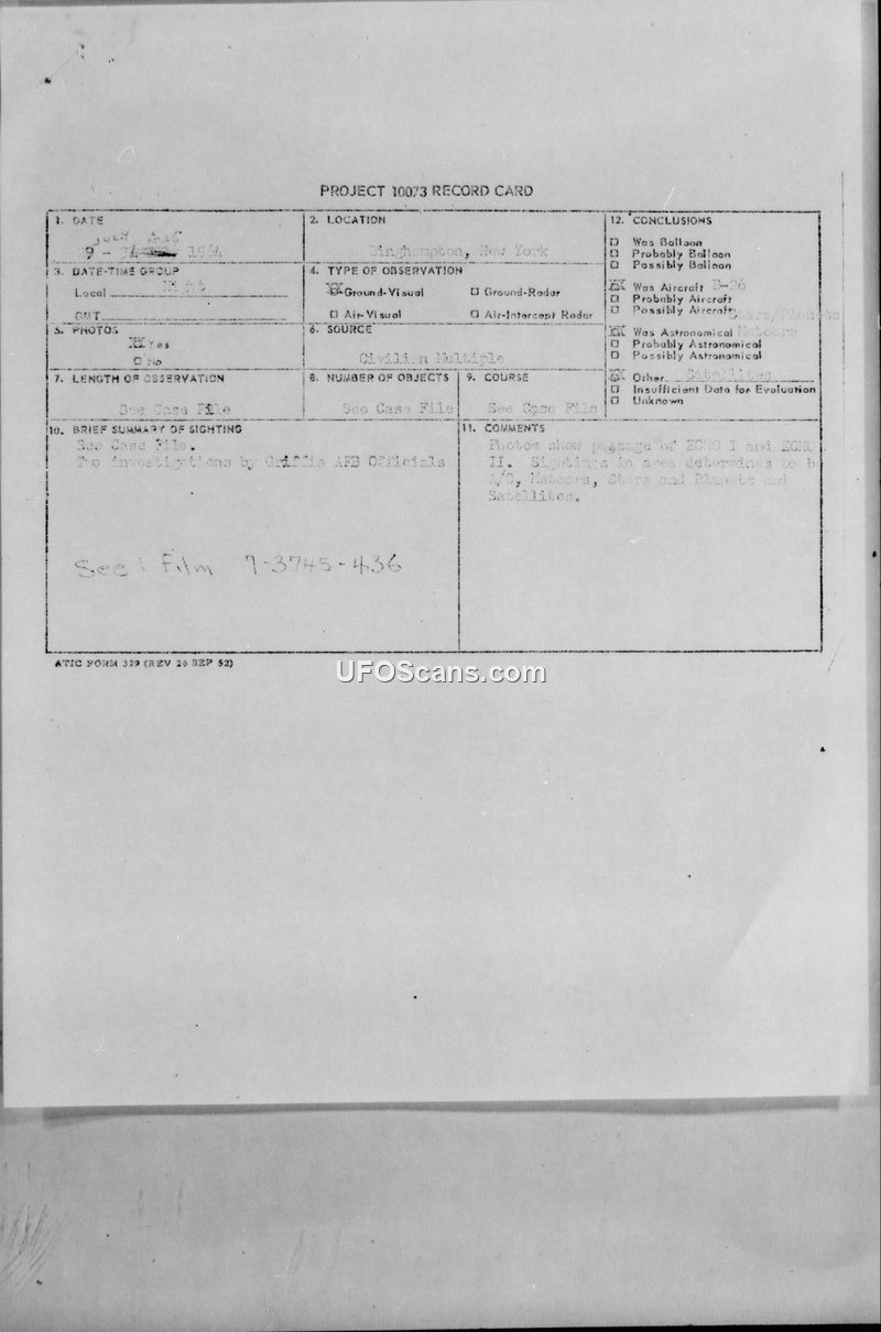 This report investigates a series of UFO sightings in Binghamton, NY, in July 1964, concluding they were misidentified conventional aircraft, satellites, and astronomical phenomena. The investigators attribute the surge in reports to media sensationalism.