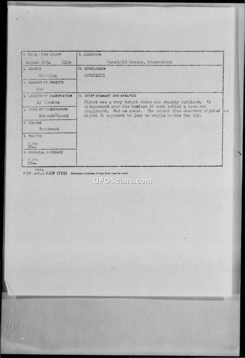 A 12-year-old witness reported a bright, white, silent object in the sky over Mansfield Center, Connecticut, in August 1964. The Air Force investigated the report and officially concluded the object was a satellite.
