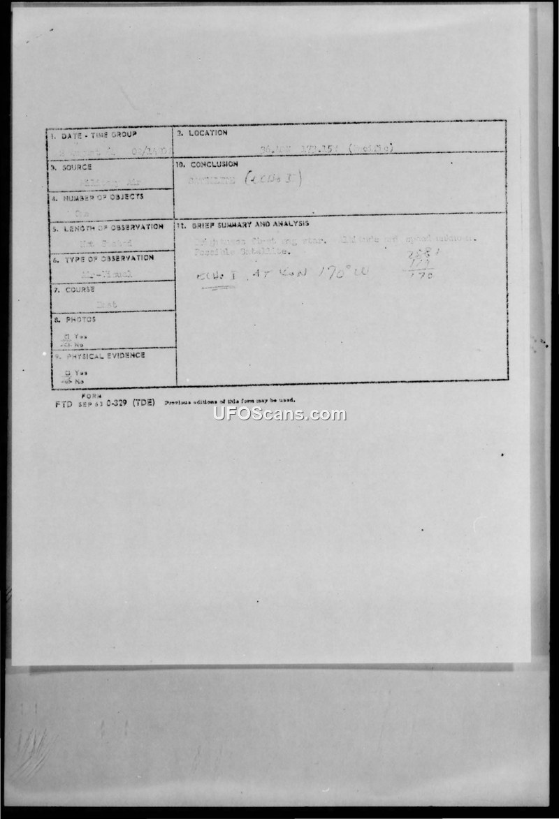 The object was observed at 1420Z on 2 August 1964, moving east. It was described as having the brightness of a first magnitude star. The official conclusion provided in the report is that it was a possible satellite.