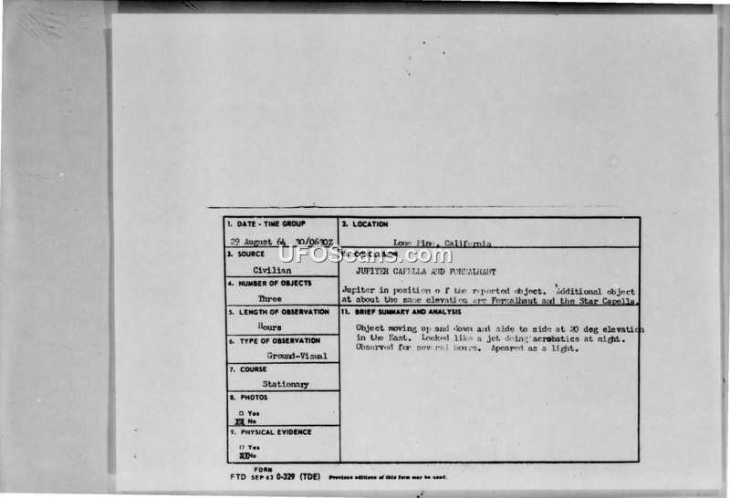 A civilian report of three light-emitting objects near Mt. Whitney, California, in 1964. The Air Force concluded the objects were the planet Jupiter and the stars Formalhaut and Capella.