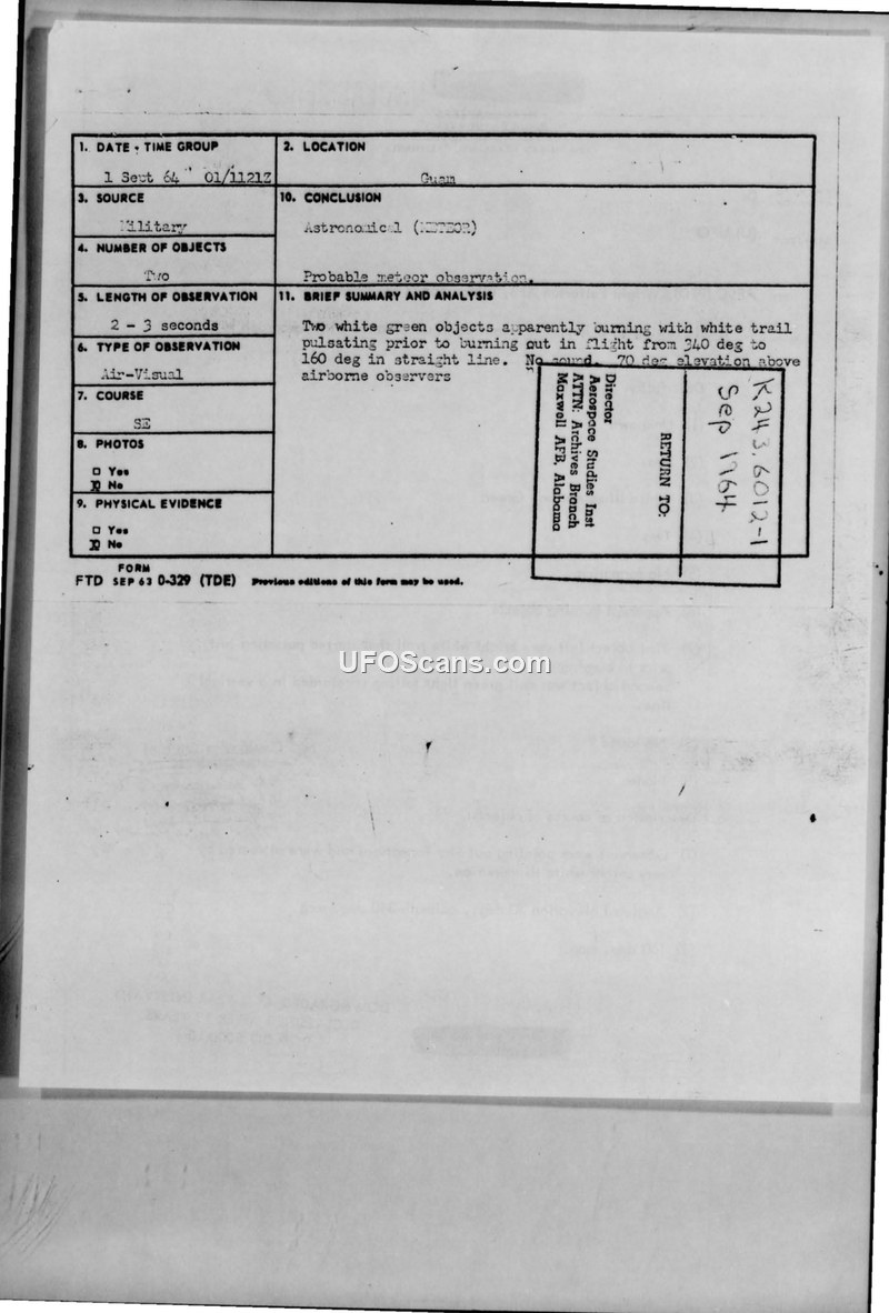 A U.S. Navy flight crew observed two unidentified burning objects over Guam on September 1, 1964. The objects, which displayed white and green light, were officially classified as unknown.