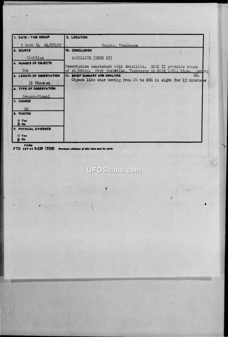 A civilian sighting of a star-like object near Sparta, Tennessee, on September 3, 1964, was officially identified by the Air Force as the Echo II satellite. The report provides standard military documentation of the event, including meteorological conditions and witness observations.