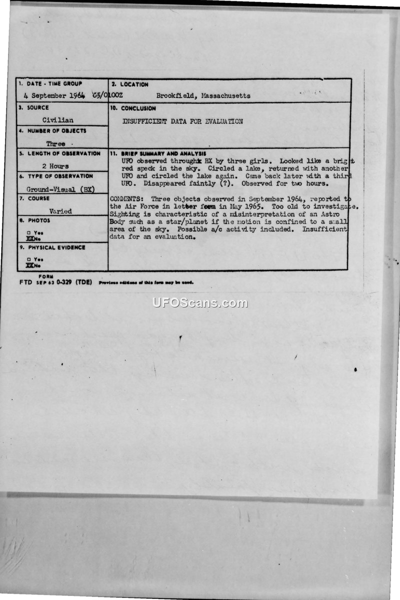 Sighting Report — Brookfield, Massachusetts, 4 September 1964