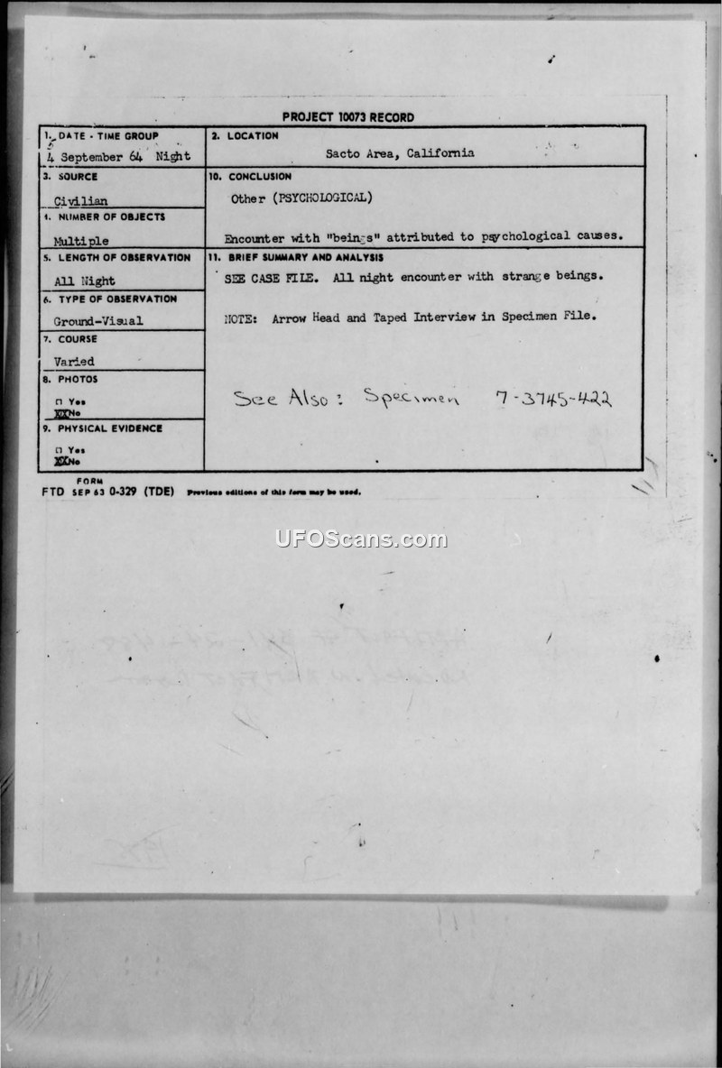 Project 10073 Record: Sacto Area, California Sighting, 4 September 1964