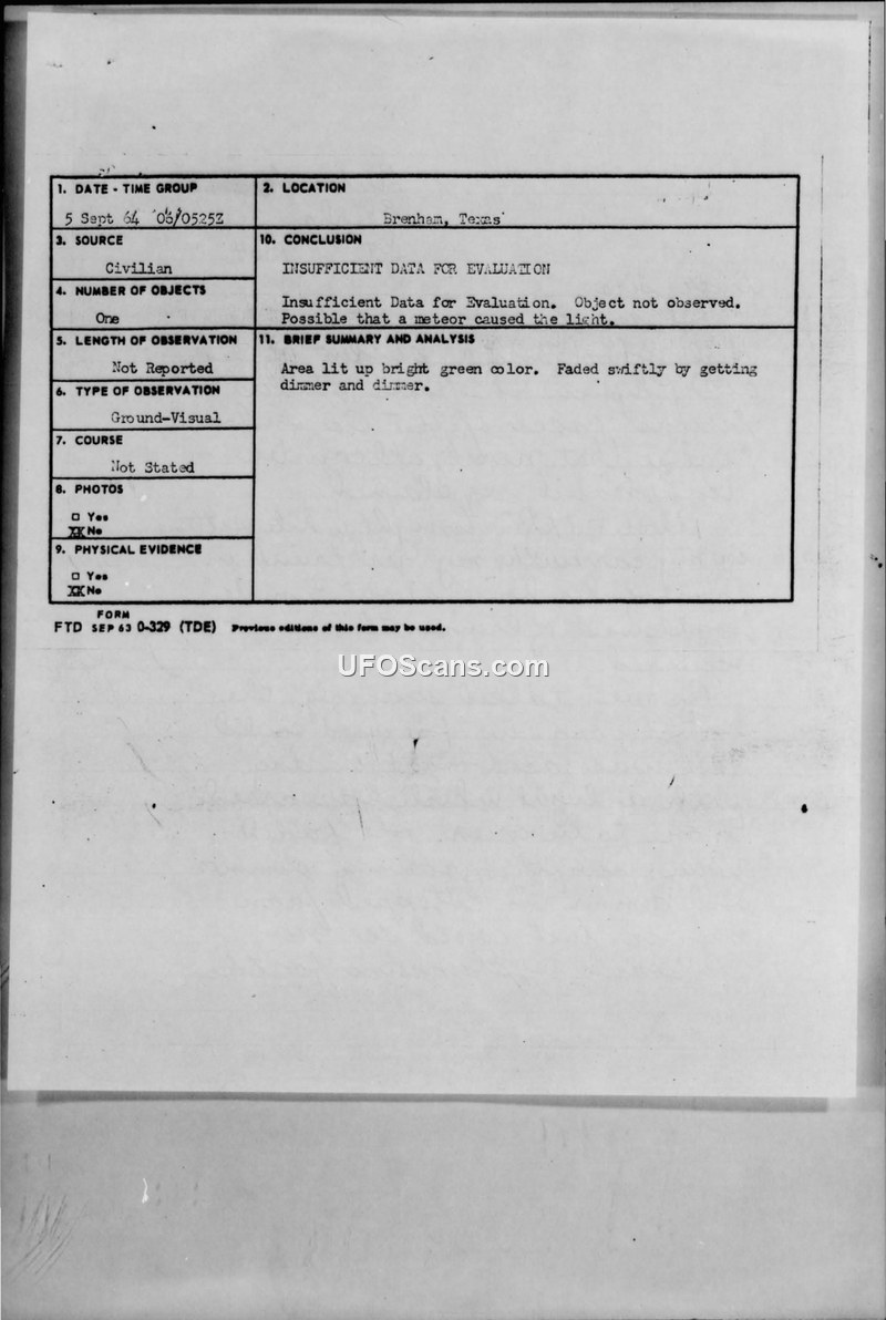 A high school student reported a bright green light in the sky over Brenham, Texas, on September 5, 1964. The Air Force concluded there was insufficient data to identify the object, suggesting it may have been a meteor.