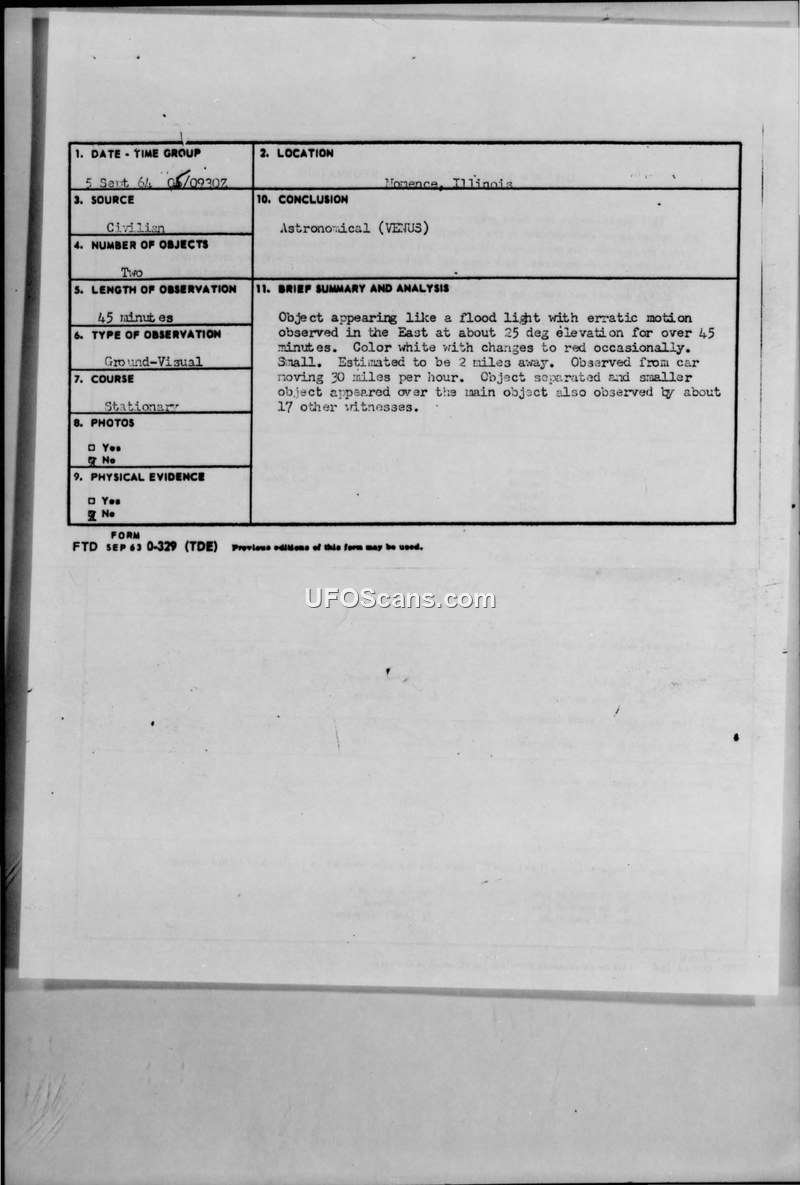 A civilian report from Momence, Illinois, regarding a sighting of an object on September 5, 1964. The U.S. Air Force concluded the object was the planet Venus.