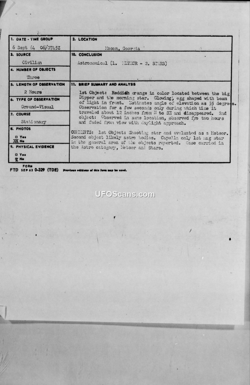 A group of witnesses in Macon, Georgia, reported an egg-shaped object and two star-like objects on September 6, 1964. The Air Force concluded the sightings were likely a shooting star and stars, influenced by witness fatigue and imagination.