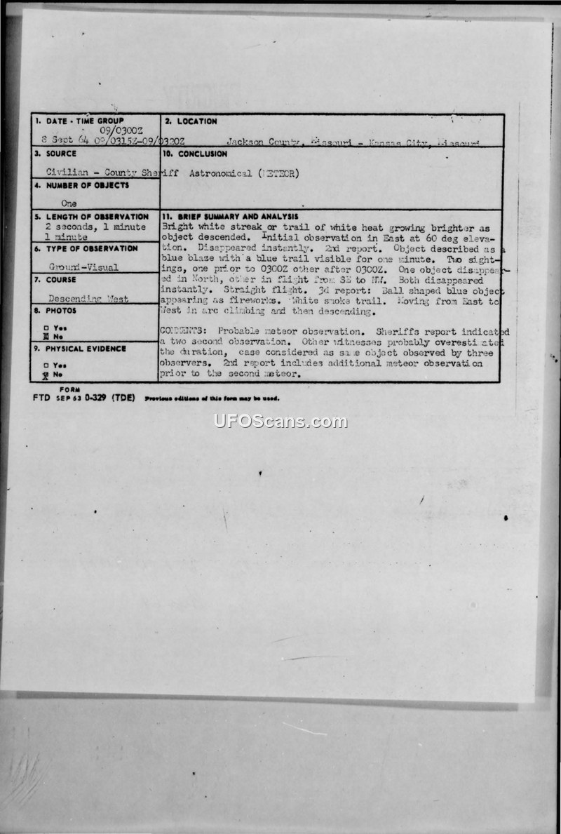 UFO Report: Jackson County, Missouri, 9 September 1964