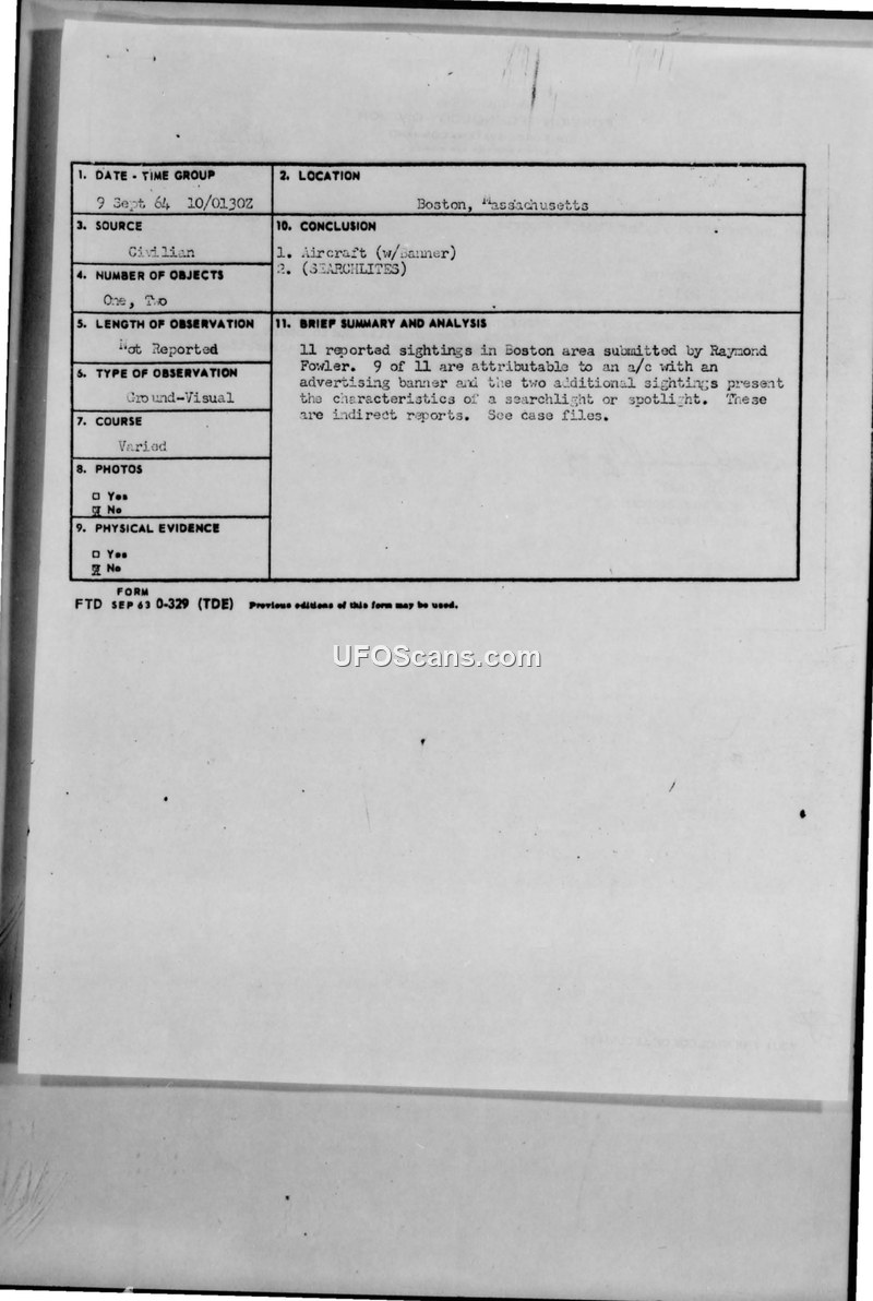 UFO Sighting(s) — 9 September 1964, Boston, Massachusetts