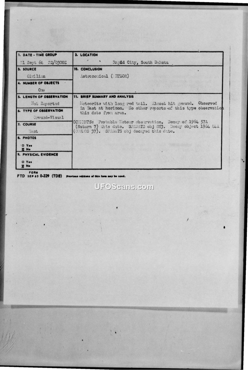 On September 21, 1964, at approximately 2000 MST, a civilian witness in Rapid City, South Dakota, reported observing a fiery object in the sky. The witness described the object as being located due east of the horizon, noting that it possessed a long red tail and appeared to be larger than a typical meteorite. The witness further stated that the object appeared to almost hit the ground. The report was received by Base Operations at Ellsworth Air Force Base at 2008 MST. Because the witness did not have a telephone, the 821st Combat Support Group forwarded the report to the Air Force Systems Command's Foreign Technology Division at Wright-Patterson AFB for further evaluation. The official analysis concluded that the sighting was a probable meteor observation, specifically attributing the event to the decay of space objects 1964 57A (Saturn 7) and 1964 44A (COSMOS 37), as tracked by SPADATS.