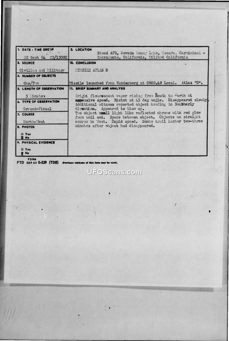 UFO Sightings, 22 Sep 64 - Stead AFB, Nevada