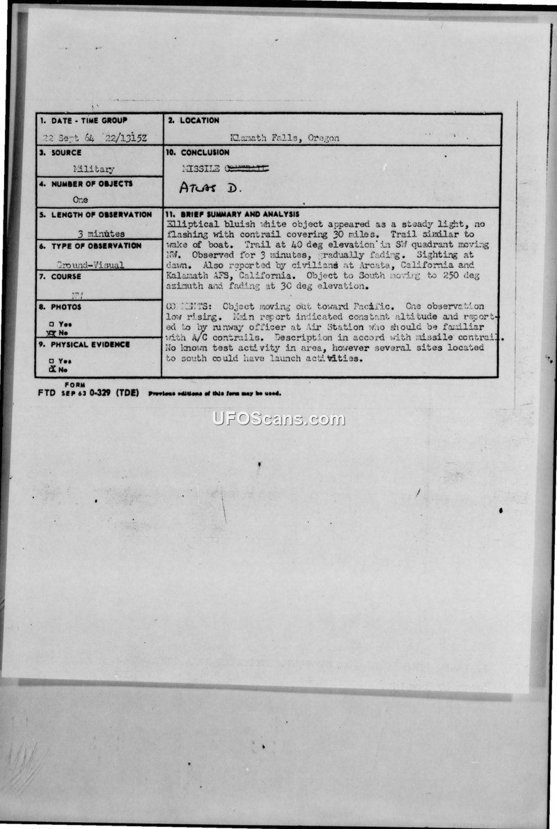 On 22 September 1964, at 1315Z, a sighting of an unidentified aerial object was reported at Kingsley Field, Klamath Falls, Oregon. The primary witnesses were Captain James Amborn of the 322nd Fighter Interceptor Squadron and a control tower operator. The object was described as an elliptical, bluish-white light with no definite outline, accompanied by a 30-mile-long contrail resembling the wake of a boat. The object was observed for approximately three minutes, moving initially northwest before shifting toward the south, where it eventually faded at 30 degrees elevation. Additional reports were received from civilians in Arcata, California, and from A1C Robert W. Walstrom at Klamath AFS, California, who described the object as a starlike light with a long, fan-shaped tail of glowing smoke. The official conclusion reached by the Air Force intelligence staff was that the phenomenon was a missile contrail, specifically an Atlas D. While no specific test activity was confirmed in the immediate area, the report noted that several sites located to the south were capable of such launch activities.