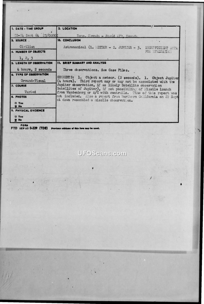 This document contains official Air Force intelligence reports from September 1964 regarding three separate aerial sightings in Nevada. The sightings were officially attributed to astronomical phenomena, specifically a meteor and the planet Jupiter, with one report remaining inconclusive.