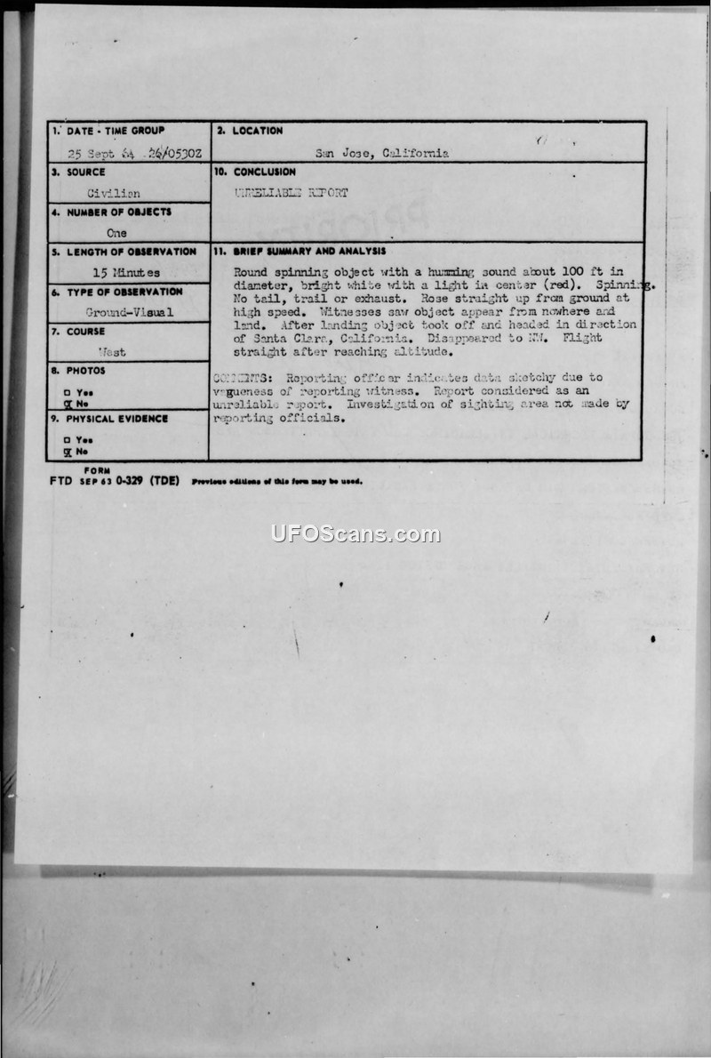 A 1964 sighting report from San Jose, California, describes a 100-foot spinning object. Military investigators deemed the report unreliable, suggesting it was likely a searchlight reflection.