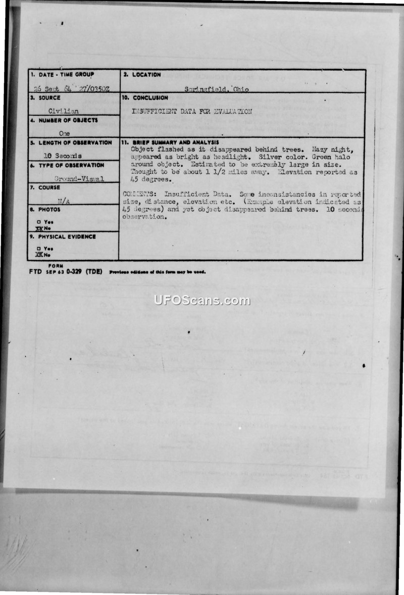 A 1964 U.S. Air Force sighting report from Springfield, Ohio, describing a bright, silver object with a green halo. The Air Force concluded there was insufficient data for evaluation due to inconsistencies in the witness's account.