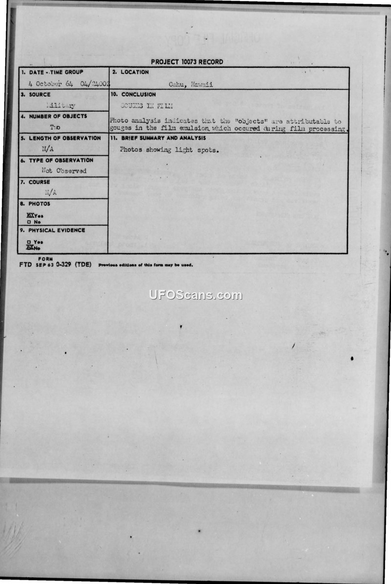 A UFO sighting report from Hawaii in 1964 was investigated by the Air Force. The analysis concluded that the 'objects' in the photographs were actually physical gouges in the film emulsion caused during processing.
