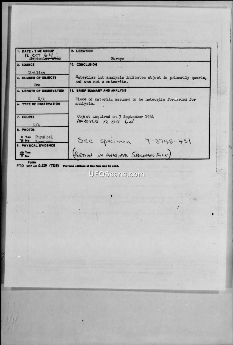 Lab analysis of the specimen, assigned Analytical Branch No. 4-1591, determined it was primarily quartz and not a meteorite. X-ray diffraction showed no pattern, and infrared spectrum analysis indicated an inorganic silicate.