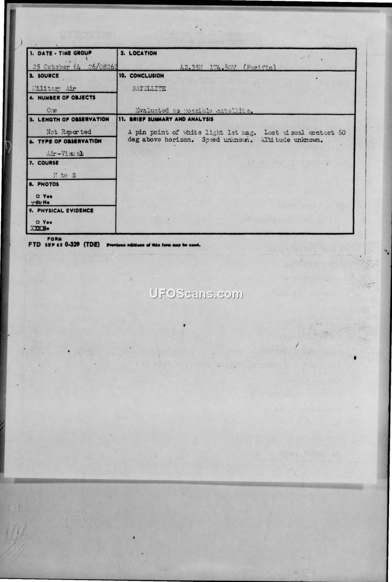 A CIRVIS report from October 1964 details the sighting of a 1st magnitude white light moving North to South over the Pacific. The object was officially evaluated as a possible polar orbiting satellite.
