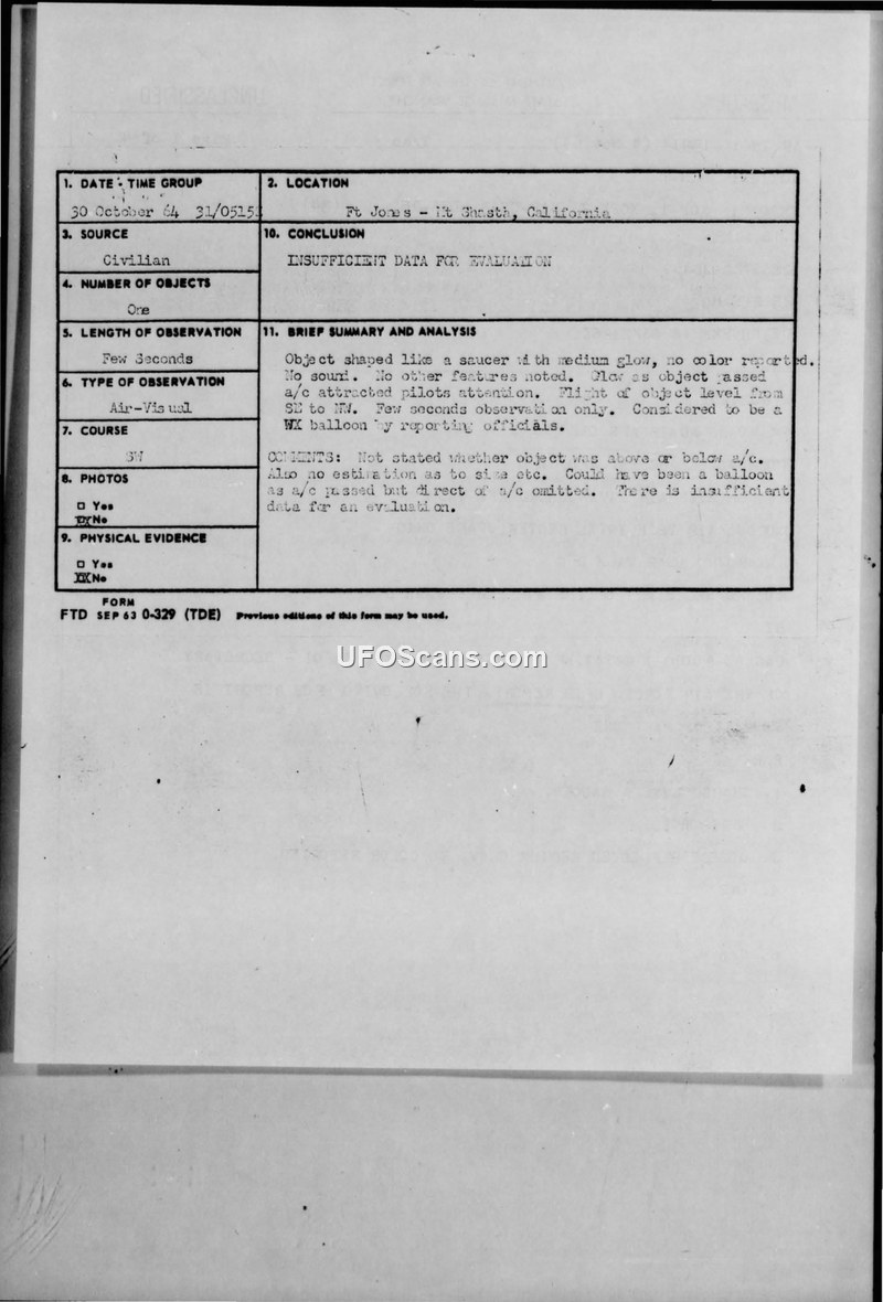 A private pilot reported a saucer-shaped, glowing object near Mt. Shasta on October 31, 1964. Air Force investigators concluded there was insufficient data to identify the object, suggesting it may have been a weather balloon.