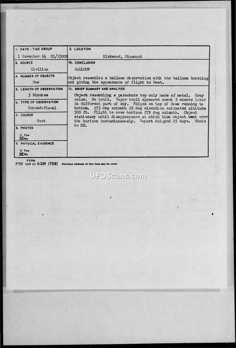 On 1 November 1964, at approximately 2300Z, a civilian observer in Kirkwood, Missouri, reported a sighting of an unidentified aerial object. The observer, a 35-year-old male, described the object as having a parachute-like shape with metallic cords and a grayish, domed surface featuring ridges. The object was initially observed at an elevation of approximately 300 feet and an azimuth of 275 degrees. It remained stationary for a period of three minutes before moving rapidly toward the west and disappearing instantaneously. The observer noted that a vapor trail appeared in a different part of the sky five minutes after the sighting. The observer, who was described by his employer as reliable, expressed a personal belief that the object was a spacecraft constructed of magnesium and powered by magnetic or anti-gravity forces. The Air Force investigation, conducted by Glenn R. Woods of the Military Air Transport Service, noted a significant delay in the reporting of the incident. While the official conclusion categorized the object as a balloon, the report acknowledges that a U.S. Weather Bureau balloon released from Lambert St. Louis Municipal Airport at the time would have traveled in the opposite direction (northeast) of the object's observed path. No physical evidence or photographs were obtained, and no radar contact was reported.