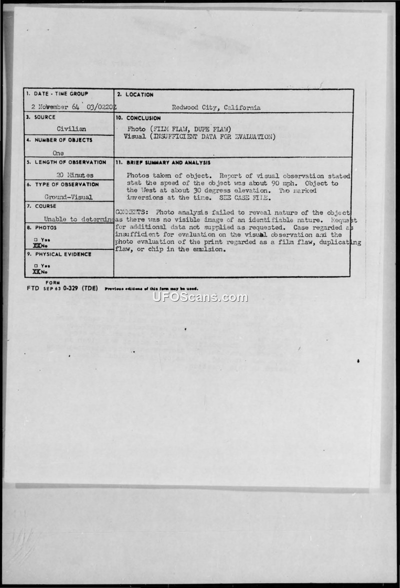 On November 2, 1964, a civilian witness in Redwood City, California, reported observing an unidentified flying object while driving on the Bayshore Freeway. The witness, who identified himself as a professional photographer and amateur astronomer, described the object as a round, rotating light that fluctuated in color between white and orange. He noted that the object initially appeared as a single unit, transformed into a string of lights, and then returned to a single unit. The sighting lasted approximately 20 minutes, during which the object maintained a straight flight path at an estimated speed of 80-90 mph. The witness took color photographs of the object using a 35mm Leica camera. The sighting was reported to the Mill Valley Radar Site and subsequently investigated by the Air Force. Military personnel, including 2d Lt James L. Young, concluded that the object was not a weather balloon, citing wind conditions that precluded the presence of a weather bureau balloon in the area. The Foreign Technology Division (FTD) conducted a microscopic analysis of the 35mm film provided by the witness. Their report, dated December 16, 1964, concluded that no true photographic image was visible on the film. Analysts suggested that the visible marks on the film were likely a film flaw, a duplicated flaw, or a chip in the emulsion. They further noted that the constant density from film edge to film edge suggested the film might have been exposed in the open rather than in a camera, and that the photograph appeared to have been taken after dark, contradicting the witness's report of a dusk sighting. Despite the photographic analysis, the Air Force remained unable to make a positive identification of the object observed.