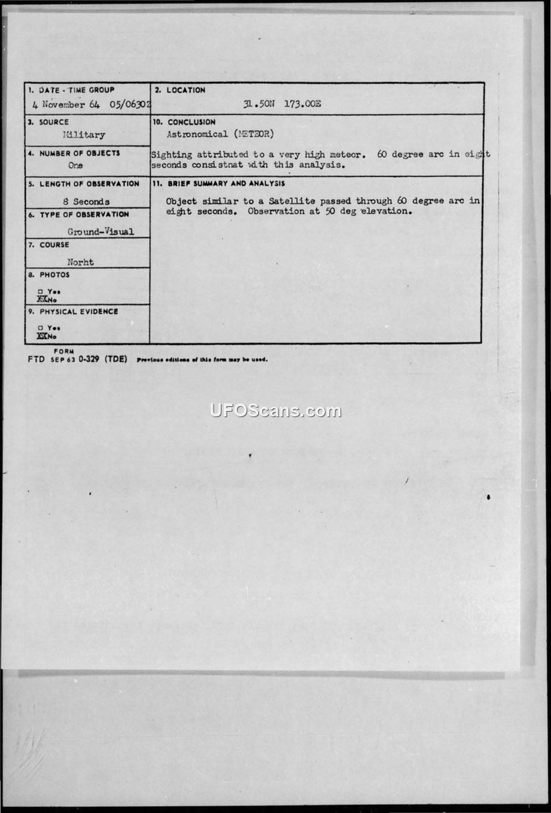 Sighting Report: 4 November 1964, 31.5N 173.00E
