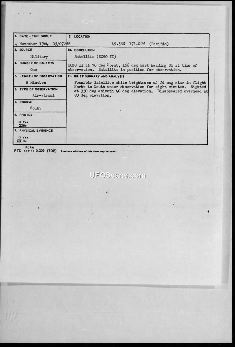 A military sighting of a white, tailless object in the Pacific on 4 November 1964 was officially identified as the ECHO II satellite. The report was documented in multiple incoming military messages.