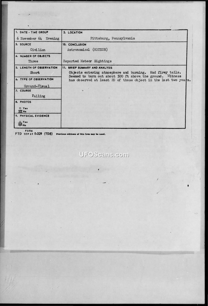 Meteor Sightings (6 Nov 64) - Pittsburgh, Pennsylvania
