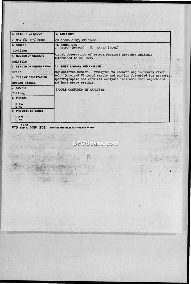 The Air Force investigated a 23-pound rock recovered by two teenagers in Oklahoma City, concluding it was a terrestrial rock rather than a meteorite. The case highlights the Air Force's standard procedure for evaluating civilian-reported UFO sightings through scientific analysis.