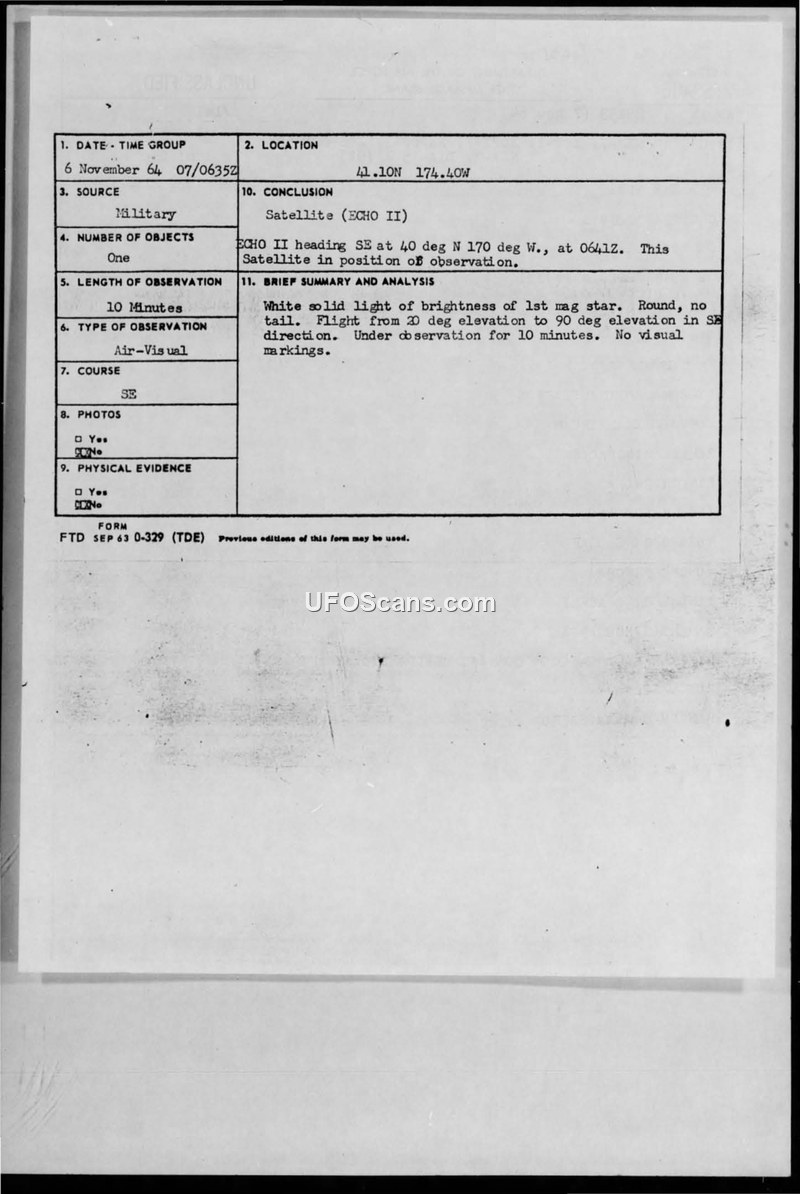A military CIRVIS report from November 1964 documents the sighting of a round, white object at 41.10N 174.40W. The object was officially identified as the ECHO II satellite.