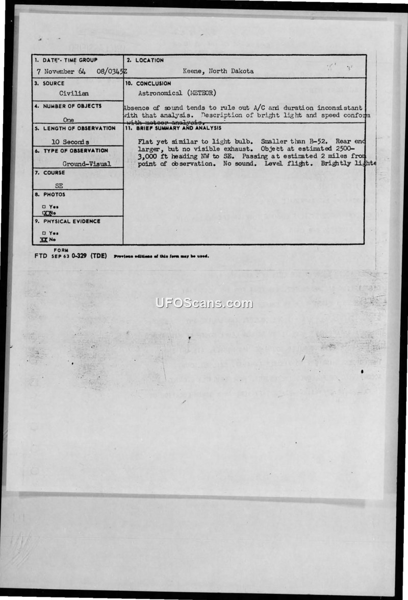 A civilian rancher and others reported a light-bulb-shaped object over Keene, North Dakota, on November 8, 1964. The Air Force officially classified the event as a meteor.