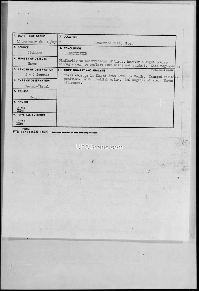 UFO Sighting Report, 14 November 1964, Menomonee Falls, Wisconsin
