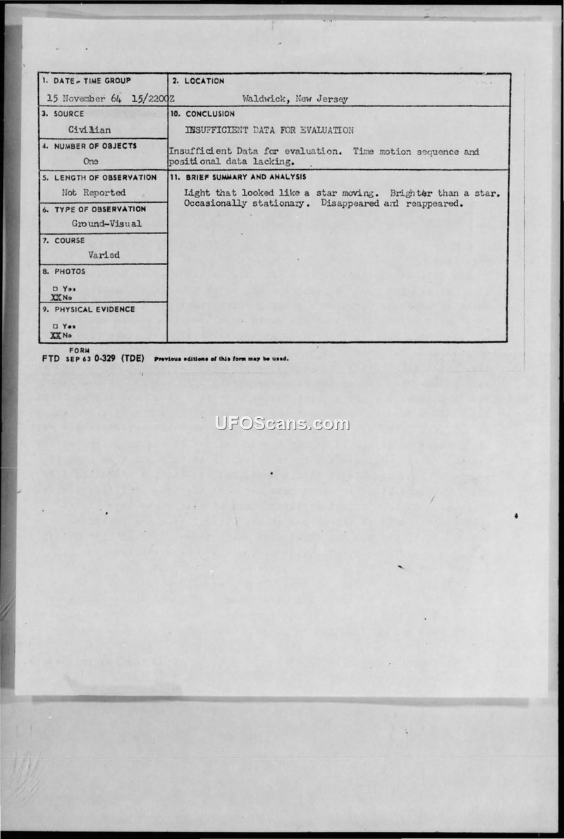 Due to insufficient information, we are unable to evaluate your report of the lights which you observed on 15 November 1964 over Waldwick, New Jersey.