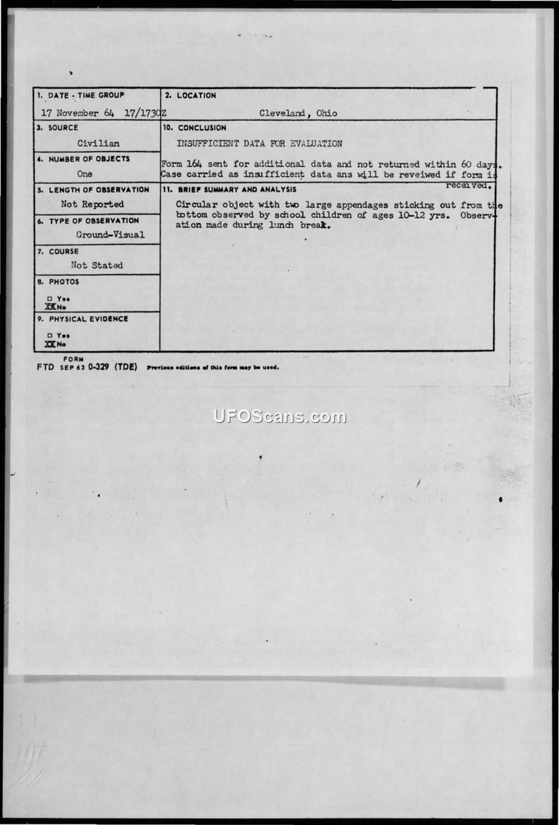 A group of school children in Cleveland reported seeing a circular object with appendages on 17 November 1964. The Air Force closed the case due to a lack of follow-up information from the witnesses.