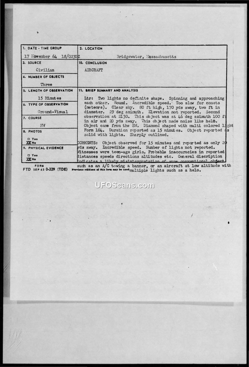 A teenage witness reported a diamond-shaped, multi-colored aerial object in West Bridgewater, Massachusetts, on November 17, 1964. The Air Force investigated the report and concluded it was likely a conventional aircraft or helicopter.