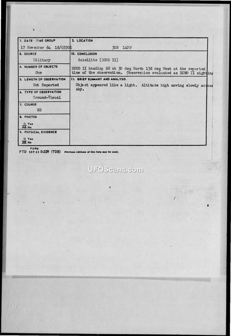 Sighting Report: Satellite (ECHO II) - 17 November 1964