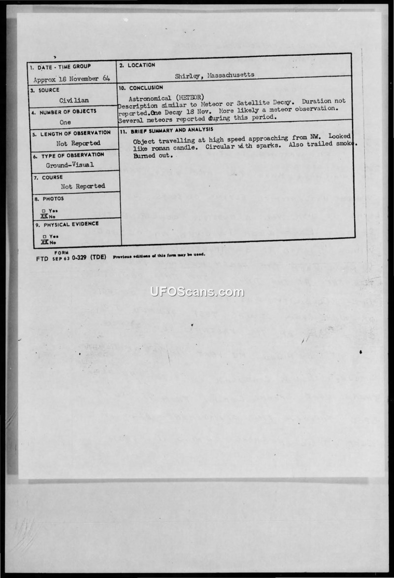 UFO Sighting, Shirley, Massachusetts, Nov 64