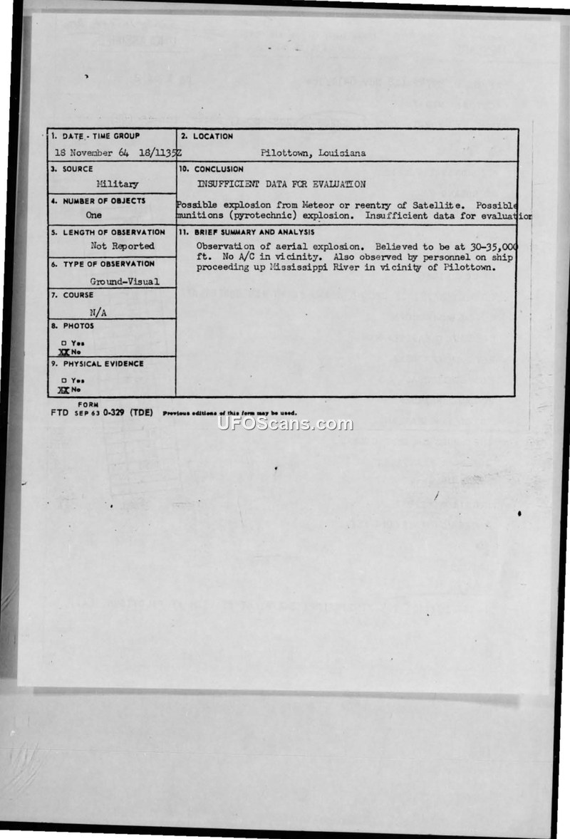On 18 November 1964, at 1135Z, an aerial explosion was observed in the vicinity of Pilottown, Louisiana. The event was reported by personnel at the Mississippi Bar Pilot Station and was also witnessed by individuals aboard the SS Polarlacht, a vessel traveling up the Mississippi River. The explosion was estimated to have occurred at an altitude between 30,000 and 35,000 feet. Air Traffic Control in New Orleans confirmed that there were no aircraft reported in the area at the time of the sighting. The official conclusion reached by the evaluating authorities was that the event could have been caused by a meteor, the reentry of a satellite, or a pyrotechnic munitions explosion, but ultimately, there was insufficient data to provide a definitive explanation.