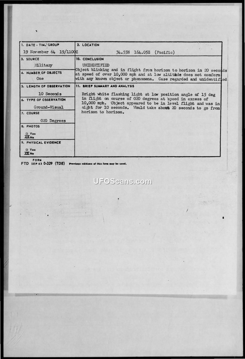 On 19 November 1964, at 1100Z, a military report was filed by the USC GC MATAGORDA regarding an unidentified aerial phenomenon observed in the Pacific at coordinates 34.55N 164.05E. The witness reported a single object displaying a bright, flashing white light. The object was observed for 10 seconds while in level flight on a course of 020 degrees. Based on the observation, it was estimated that the object was traveling at a speed in excess of 10,000 mph and would require approximately 20 seconds to traverse from horizon to horizon. The weather was reported as clear. The official conclusion reached by the evaluating authorities was that the object did not conform to any known phenomena or objects, and the case was officially classified as unidentified.