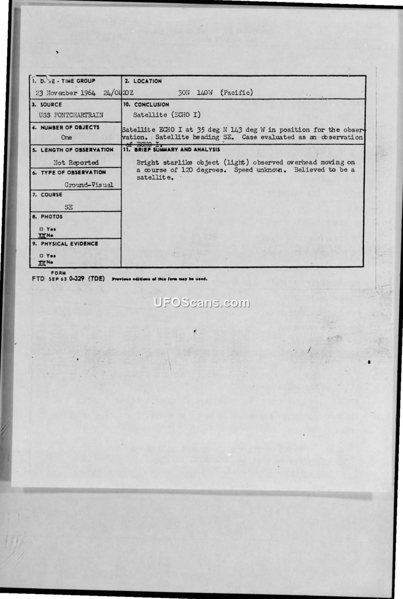 The USS PONTCHARTRAIN reported two sightings of bright starlike objects in the Pacific in November 1964. Both incidents were officially identified as observations of the ECHO I and ECHO II satellites.