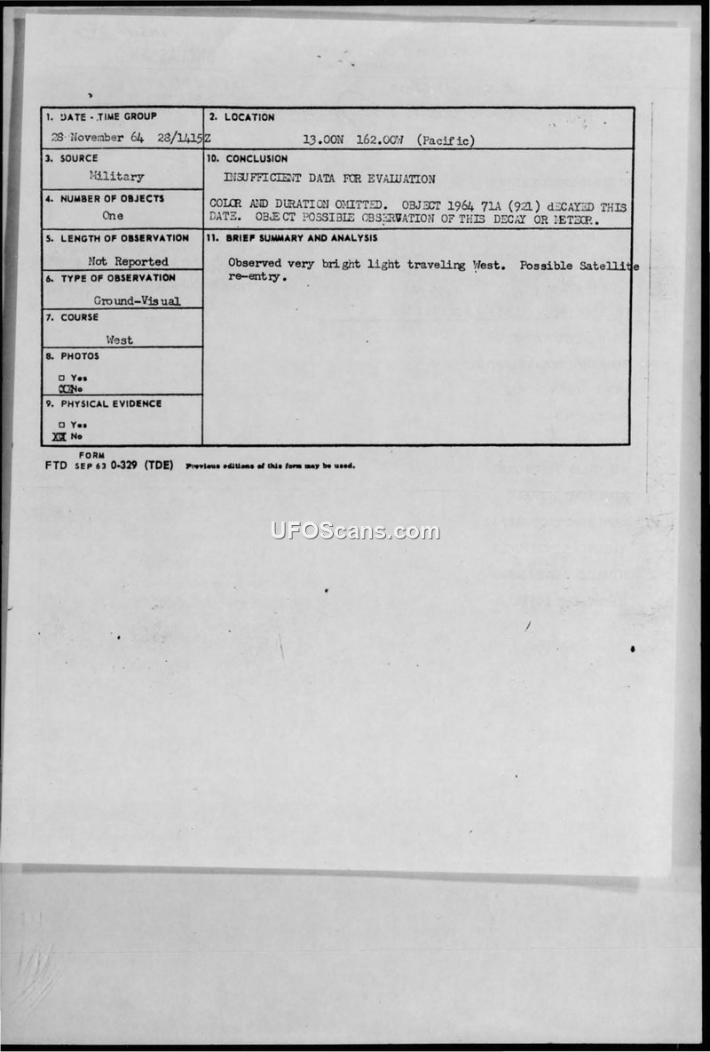 A CIRVIS report from 28 November 1964 details the sighting of a very bright object in the Pacific. The military concluded it was likely a satellite re-entry or a meteor.