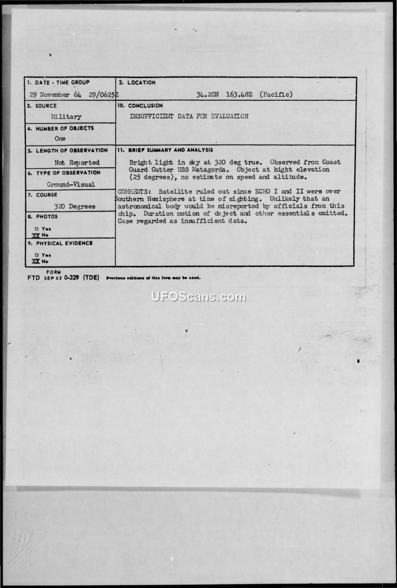 On 29 November 1964, at 0625Z, the Coast Guard Cutter USS Matagorda reported a sighting of a bright light in the sky at 320 degrees true. The object was observed at a high elevation of 25 degrees. No estimates regarding the speed or altitude of the object were provided by the observers. The military report indicates that the sighting was evaluated, and satellites ECHO I and II were explicitly ruled out as potential causes because they were positioned over the Southern Hemisphere at the time of the incident. The report further notes that it was considered unlikely that an astronomical body would be misreported by the ship's officials. However, because essential information regarding the duration and motion of the object was omitted from the report, the case was officially classified as having insufficient data for evaluation. The documentation consists of incoming military messages and a standard form (FTD SEP 63 0-329) summarizing the incident, which was subsequently retransmitted to the CIA.