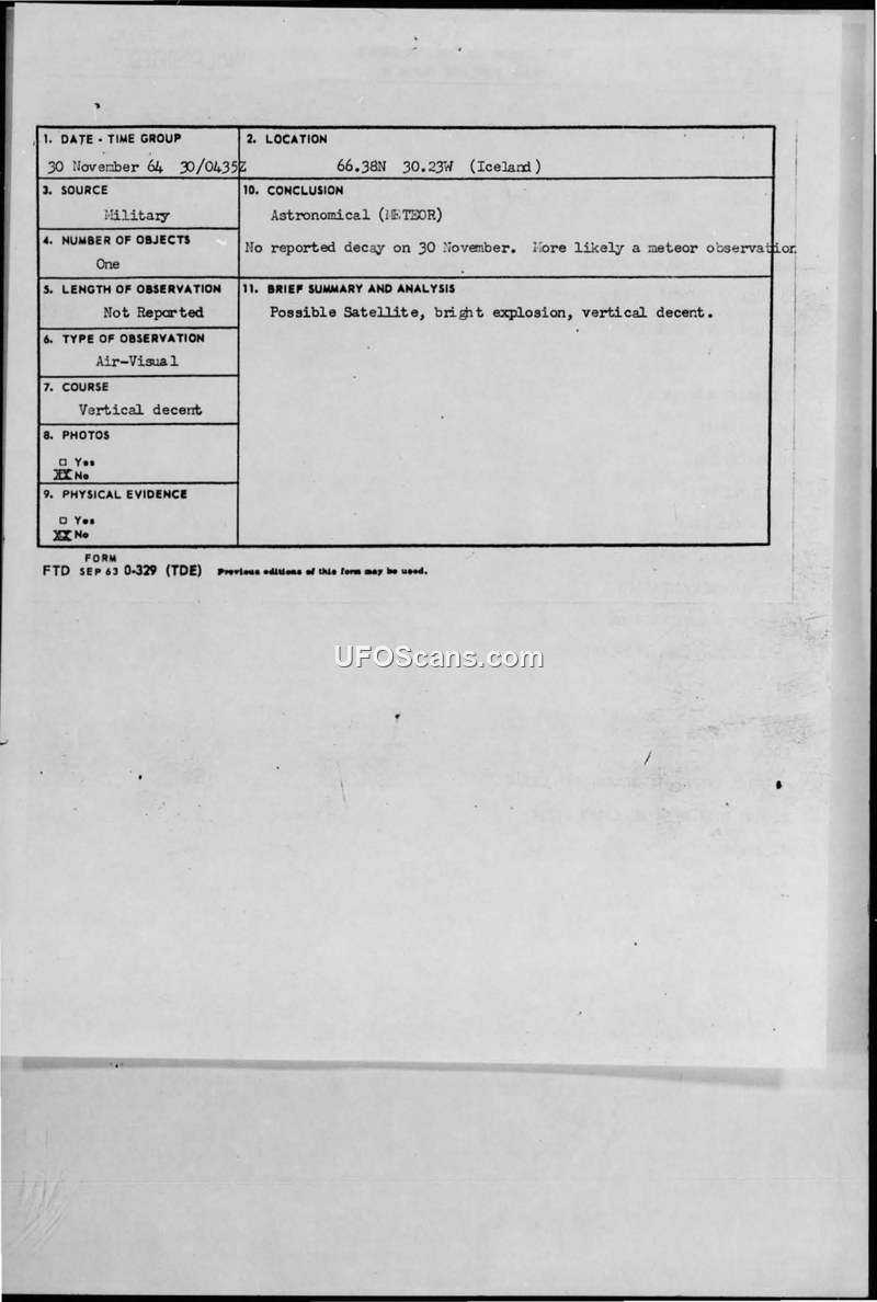 A military report from 1964 documents a sighting of a bright, descending object near Iceland. The event was officially concluded to be a meteor rather than a satellite.