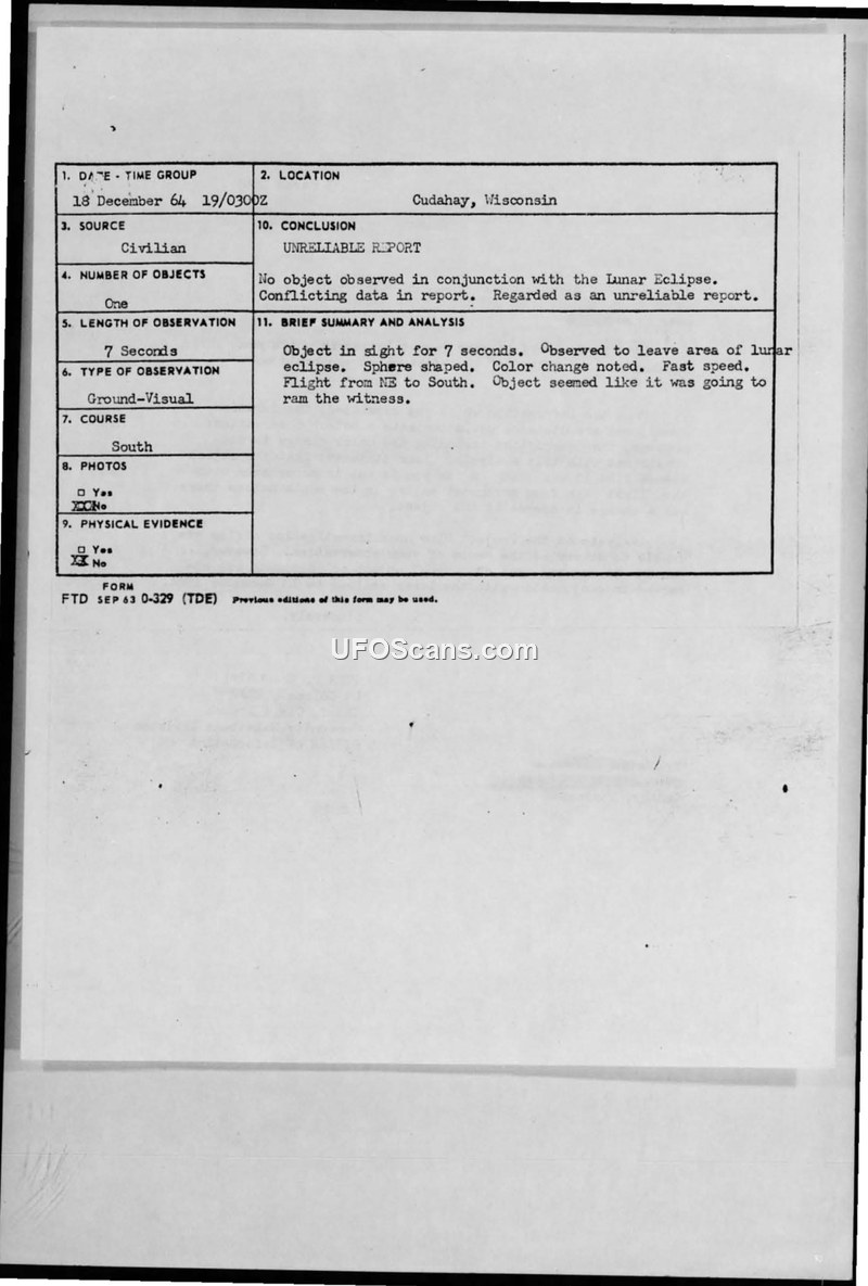 An 11-year-old reported a spherical UFO in Cudahy, Wisconsin, during a 1964 lunar eclipse. The Air Force investigated the claim but ultimately classified the report as unreliable due to conflicting data.