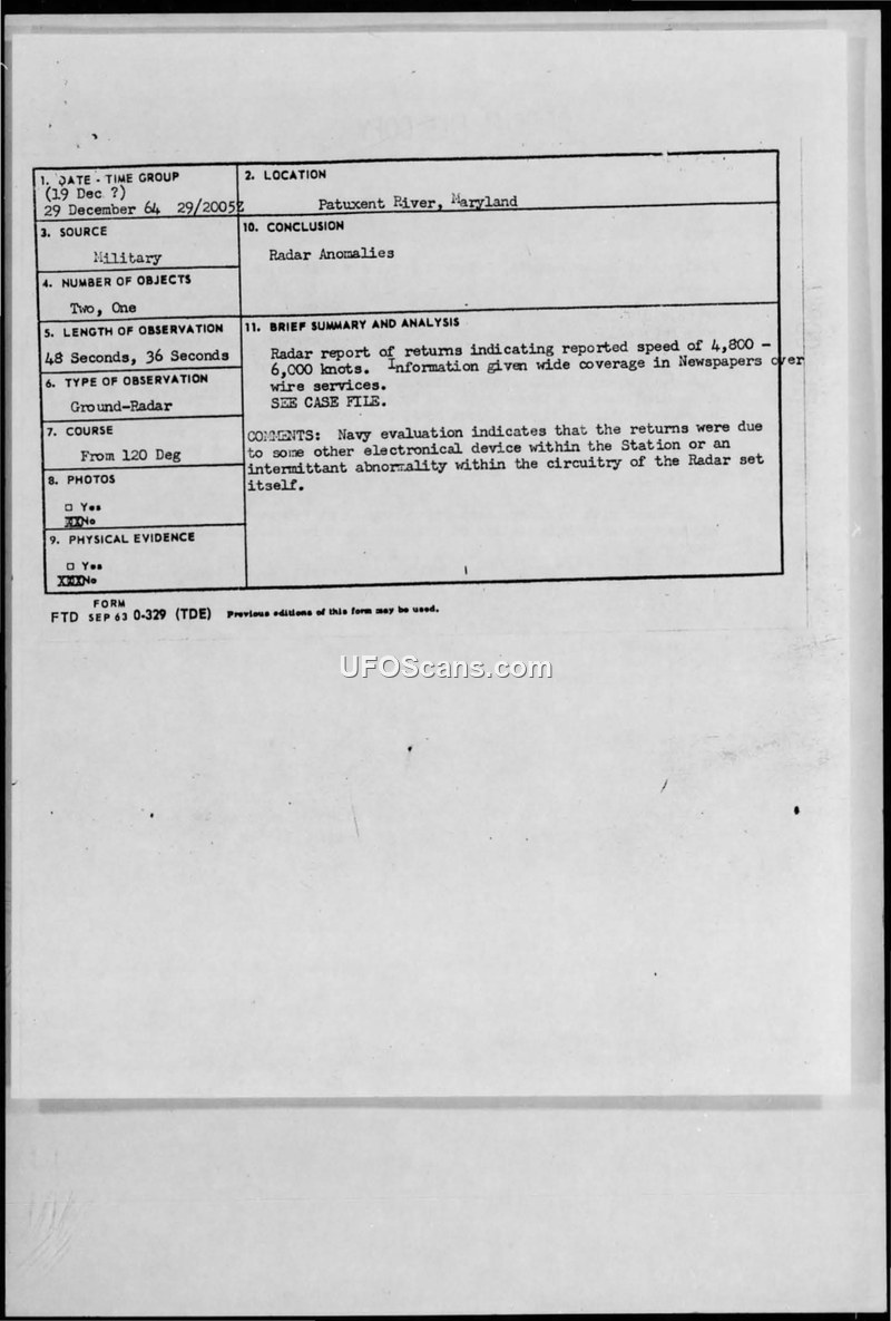 Radar operators at Patuxent Naval Air Station reported high-speed unidentified targets on December 29, 1964. The Air Force and Navy investigation concluded these were false radar returns caused by equipment malfunction or electronic interference.