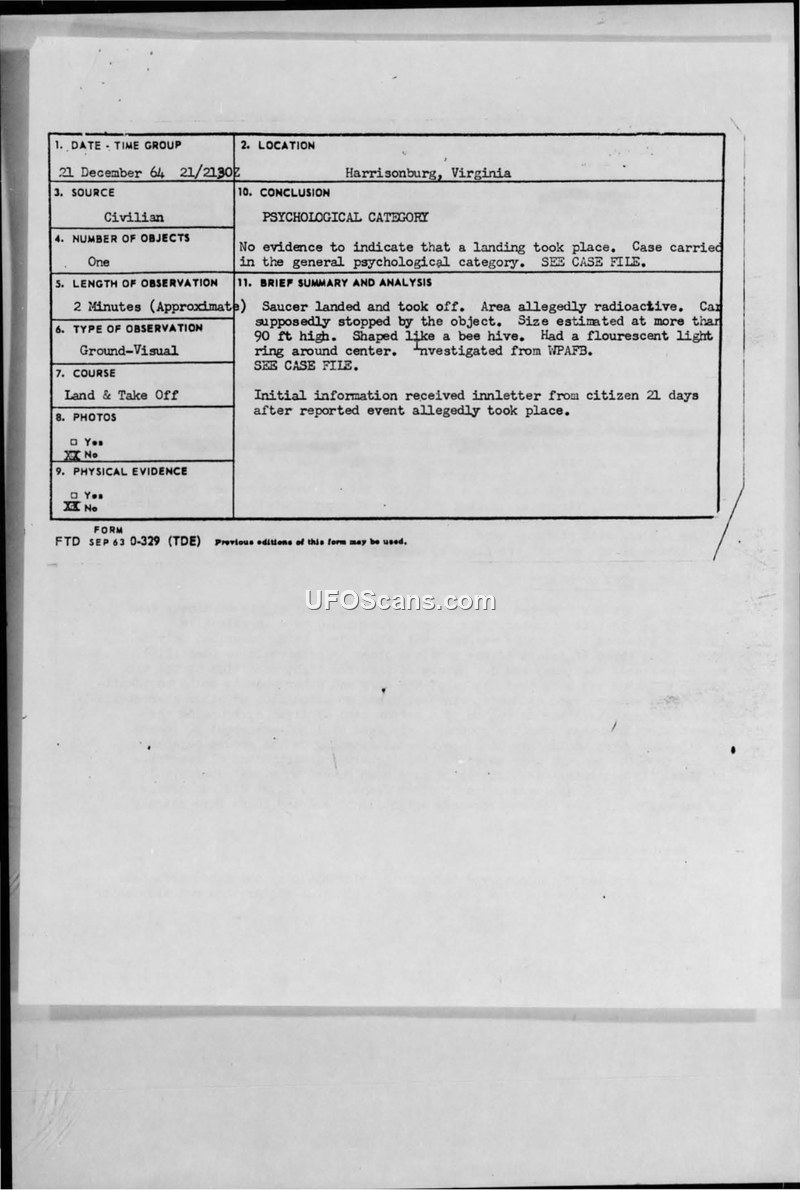UFO Sighting Report - Staunton, Virginia, 21 December 1964
