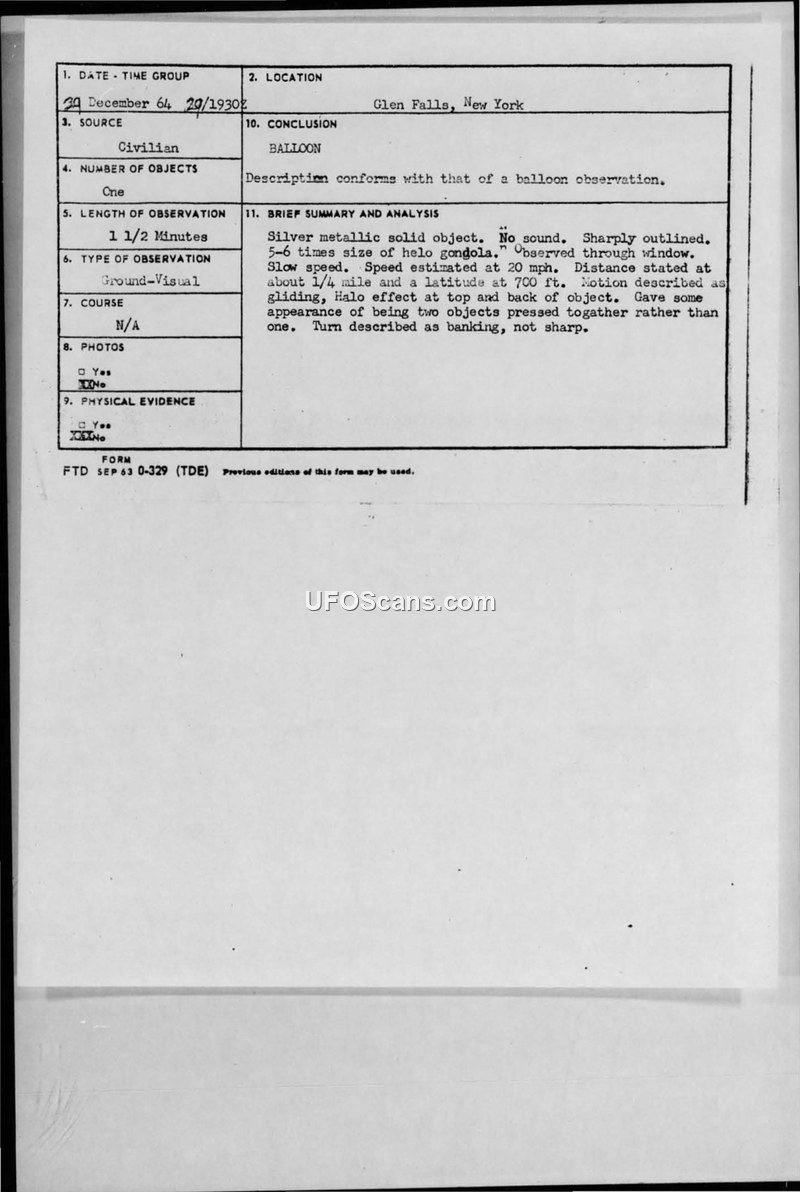 UFO Sighting Report - Glens Falls, New York, December 1964