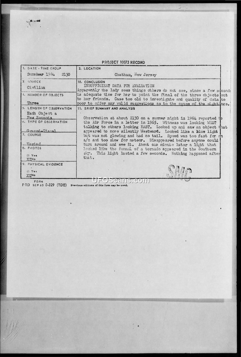 A 15-year-old witness reported a 1964 sighting of three objects in Chatham, New Jersey. The Air Force concluded in 1965 that the case was too old and lacked sufficient data for a formal investigation.