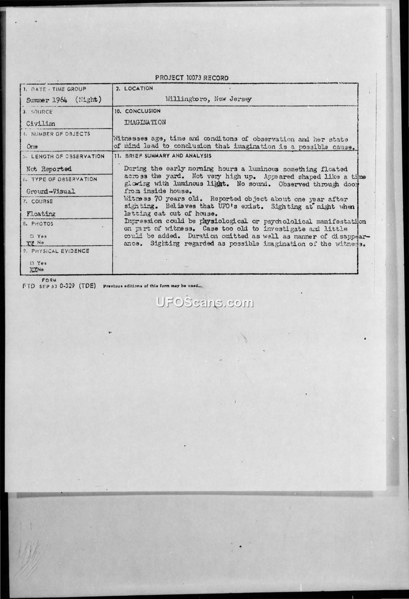 This document contains a Project 10073 record and associated correspondence regarding a UFO sighting reported by a 70-year-old civilian in Willingtoro, New Jersey. The witness reported observing a luminous, tire-shaped object floating diagonally across her yard during the night in the summer of 1964. She observed the object through a door while letting her cat out of the house. The report notes that the witness believed in the existence of UFOs. The Air Force concluded that the sighting was likely a physiological or psychological manifestation, categorizing the cause as 'imagination.' Because the report was submitted approximately one year after the event, the Air Force determined that a formal investigation was not feasible. The correspondence includes a letter from the Foreign Technology Division to the witness, explaining the Air Force's position on the UFO program and addressing other unrelated news clippings the witness had sent regarding electromagnetic clocks, a balloon over Portugal, and phenomena in the Antarctic.